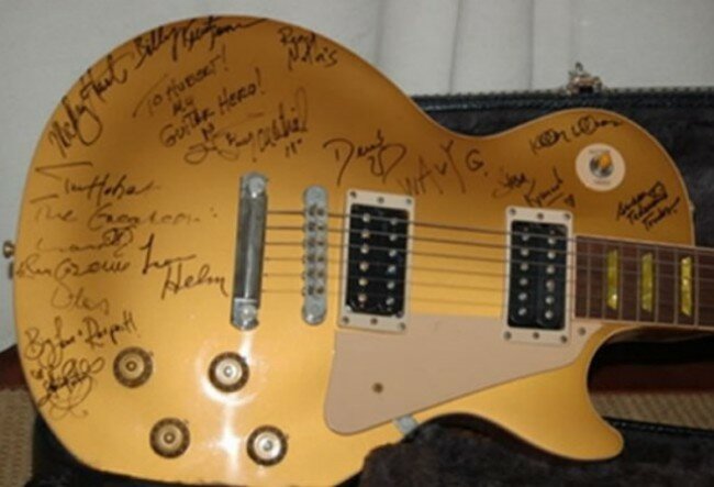 Элвис Костелло, Тадж Махал, Рид Матис – вот лишь несколько фамилий знаменитых блюзменов, оставивших свой автограф на этой золотой гитаре Gibson Les Paul. Она будет выставлена на интернет-аукционе Charitybuzz, а все средства от её продажи поступят на счет благотворительного фонда Пайнтопа Перкинса. Этот фонд был основан Миссисипским джазовым пианистом Пайнтопом Перкинсом и имеет своей основной целью оказание помощи и поддержки молодым музыкантам.